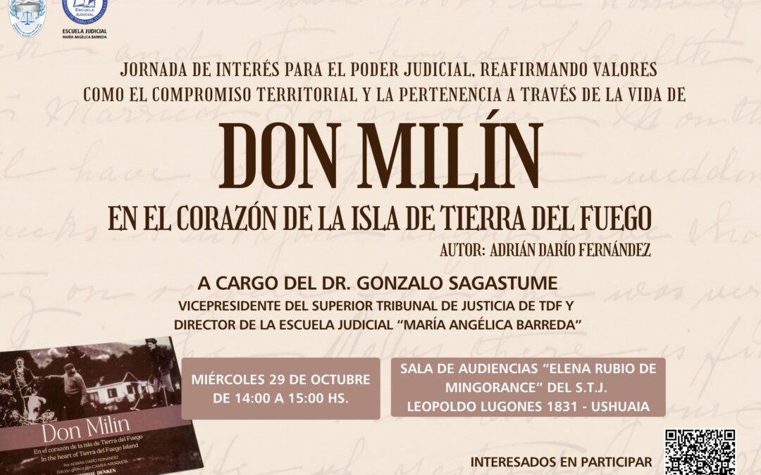 El Poder Judicial de Tierra del Fuego, a través de la Escuela Judicial “María Angélica Barreda”, invita a participar de la jornada “Compromiso territorial y pertenencia”, basada en el libro Don Milín, de Adrián Darío Fernández.