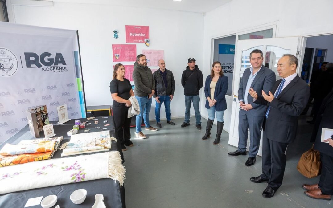Durante la mesa de trabajo que se realizó en el Espacio Tecnológico, se hizo entrega de presentes protocolares elaborados por productores y emprendedores de Río Grande, con el propósito de que el diplomático y la comitiva que lo acompañaba puedan conocer el trabajo productivo que se lleva delante en la ciudad y el valor agregado que posee.