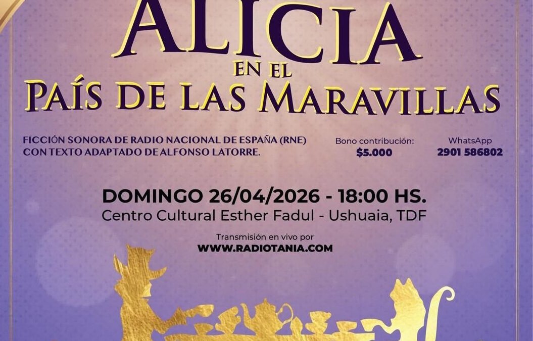 La Secretaría de Políticas Ambientales, Culturales y Educativas de la Municipalidad de Ushuaia acompañará este domingo 26 de abril a las 18:00 horas en el Centro Cultural Esther Fadul la presentación de “Alicia en el País de las Maravillas”, una ficción sonora protagonizada por el elenco “Radioteatro Recuerdos”.